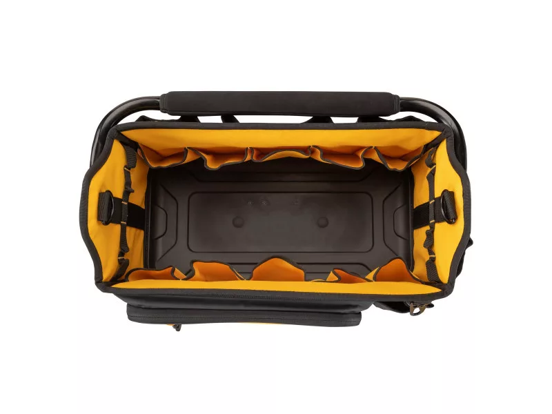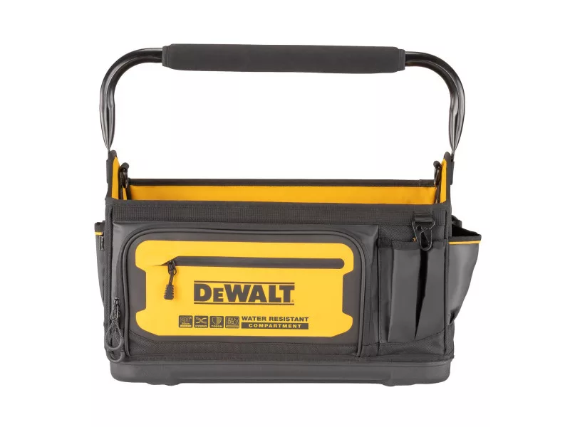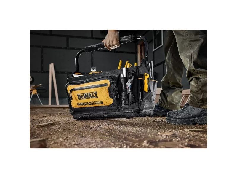 Die DEWALT DWST60106-1 ist eine 20-Zoll-Offene Werkzeugtasche, die für Haltbarkeit und Funktionalität konzipiert wurde. Die Tasche besteht aus 1680 Denier Material, das harten Arbeitsbedingungen standhält. Sie hat eine wasserdichte Beschichtung auf der Unterseite, die die Werkzeuge vor Feuchtigkeit und Verschmutzungen schützt. Der geräumige Innenraum ermöglicht die einfache Lagerung und Transport von Elektro- und Handwerkzeugen sowie Zubehör. Die Tasche ist mit einem ergonomischen Griff und Schultergurt für komfortables Tragen ausgestattet.