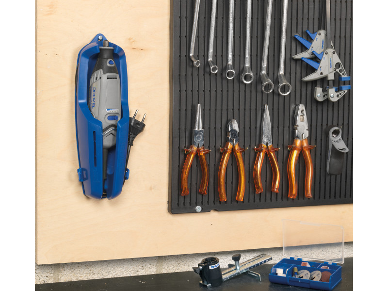 Verschiedene Aufbewahrungsmöglichkeiten: Das robust verpackte Set beinhaltet eine an der Wand montierbare Werkzeughalterung, auf der das Werkzeugkabel einfach aufgewickelt werden kann.