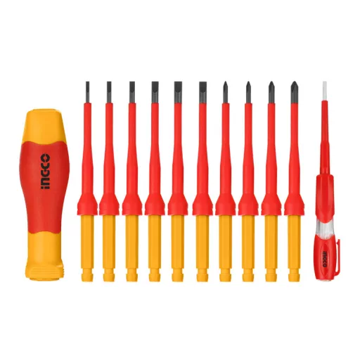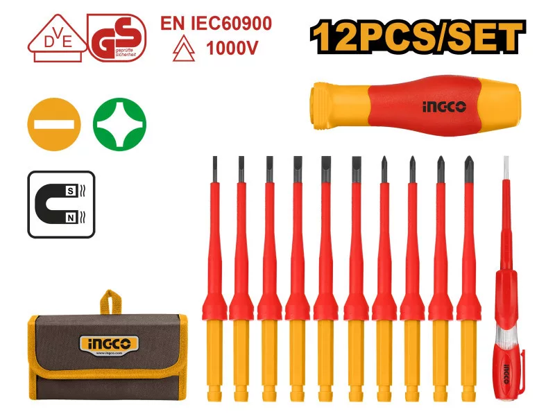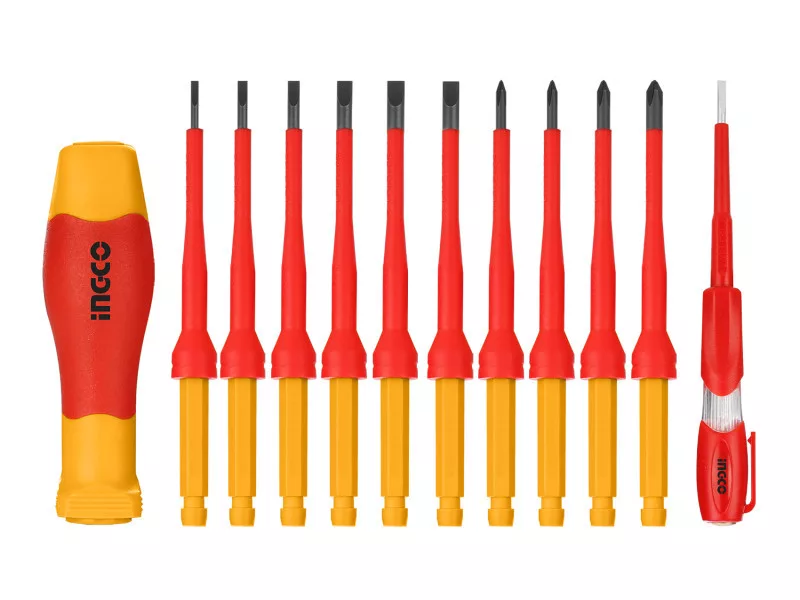 Lieferumfang: 12-teiliges Set aus austauschbaren isolierten Schraubendrehern: SL2.0 x 100 mm, SL2.5 x 100 mm, SL3.0 x 100 mm, SL3.5 x 100 mm, SL4.0 x 100 mm, SL5.5 x 100 mm, SL6.5 x 100 mm, PH0 x 100 mm, PH1 x 100 mm, PH2 x 100 mm, 1 austauschbarer Griff, 1 Spannungsprüfer 3.0 × 70 mm, verpackt in einer Leinentasche