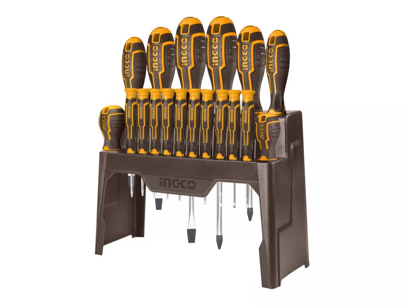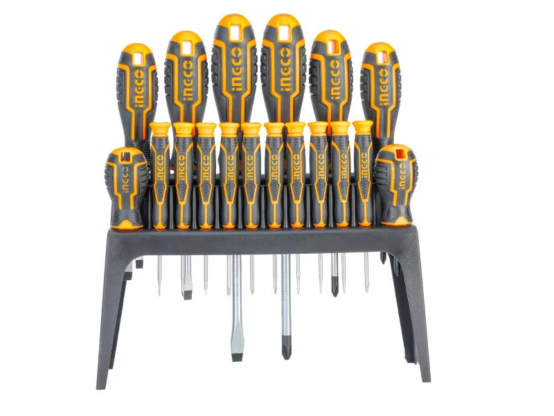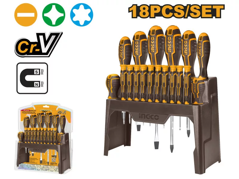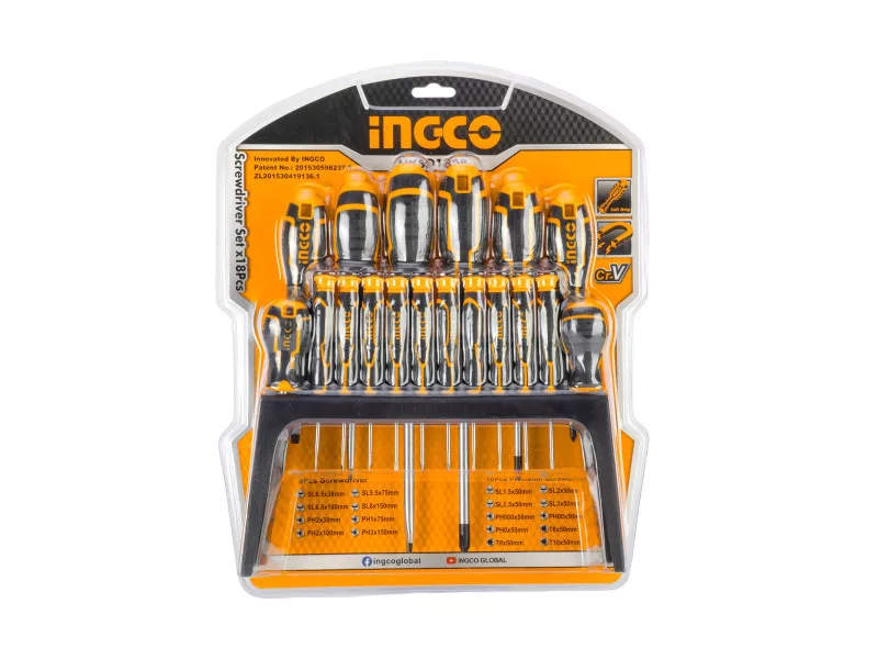Lieferumfang: 18 Stück Schraubenzieher CrV, 1 Stück Kunststoffhalter, in Blisterpackung