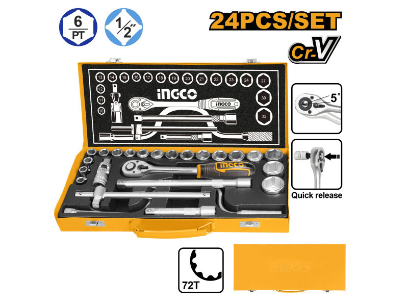 Lieferumfang: 18 Stück 1/2" Stecknüsse CrV, 2 Stück 1/2" Verlängerungsstangen, 1 Stück 1/2" T-Schlüssel, 1 Stück 1/2" universelle Gelenkverbindung, 1 Stück 1/2" Antriebswelle, 1 Stück 1/2" Ratschenantriebswelle, Metallboxverpackung