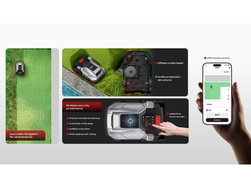 - Multi-Zone Management – akár 8 zóna önálló beállítási lehetőséggel: vágási magasság, irány, ütemezés.