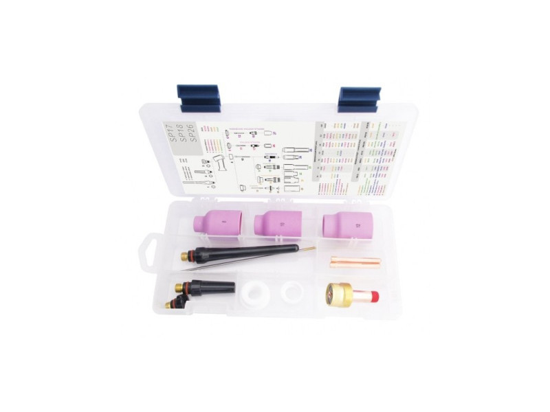 Készlet tartalma: Wolframszorító patron 1,6/50 10N23 AWI 2db Gázlencse 45V24 AWI Elektróda Wolfram 1,6x175 arany Wolframvédő sapka- hosszú 57Y02 AWI Wolframvédő sapka 300M Wolframvédő sapka- rövid 57Y04 AWI Szigetelő gyűrű 18CG AWI Szigetelő gyűrű 54N63 Gázterelő kerámia 8/12,5 57N74 JUMBO AWI Gázterelő kerámia 10/ 16 53N88 JUMBO AWI Gázterelő kerámia 12/19,5 53N87 JUMBO AWI