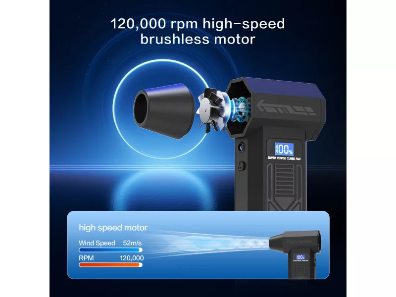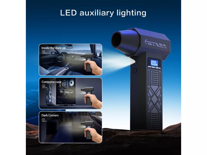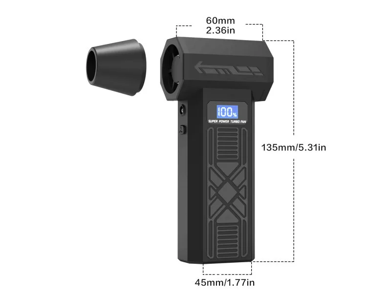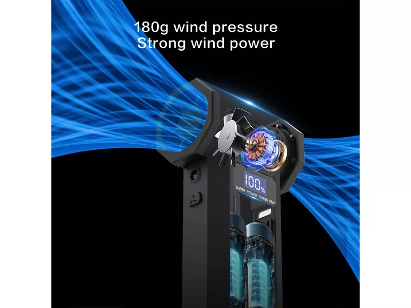 Vezeték nélküli mini turbó fúvóka sokféle otthoni és munkahelyi felhasználásra. Kézreálló, turbóventilátorral hajtva, amely akár 120000 fordulat/perc sebességre gyorsul fel a legmagasabb fokozaton. Az előállított légáram akár 180 gramm súlyú konyhai mérleget is megterheli.