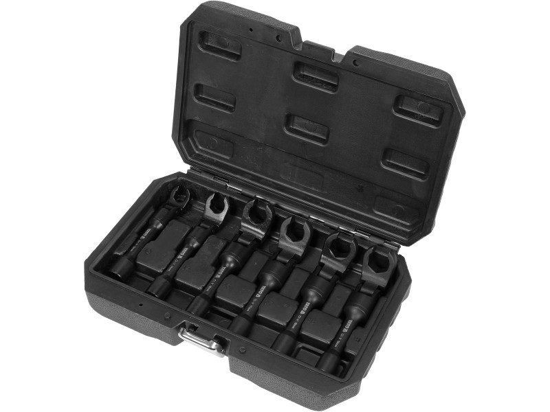 A set of open jointed ring wrenches. They are perfect for unscrewing and tightening sensors with electrical wires, hydraulic, pneumatic or fuel vents. The wrenches are durable thanks to their manufacture from steel 40Cr/CrV. The open eyelets and convenient joint are excellent for working in areas with limited access.