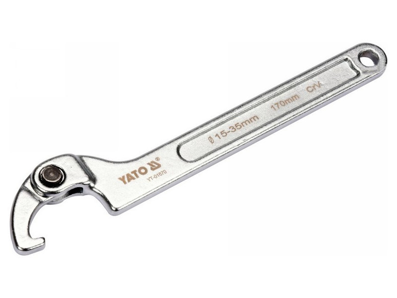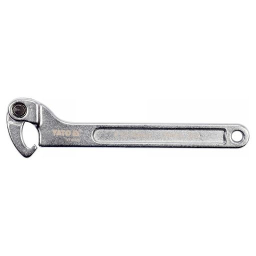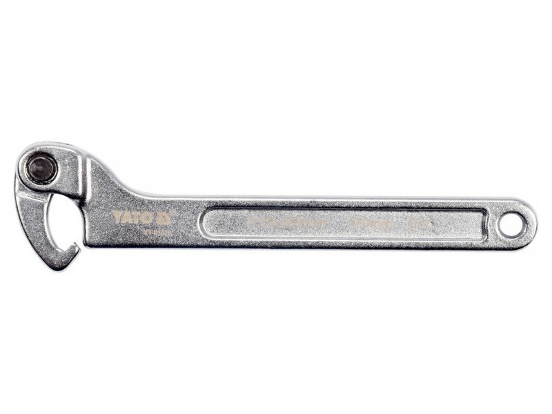 Hook-and-loop, toggle wrench made of heavy-duty CrV chrome vanadium steel. It has a matte chrome-plated surface finish. Designed for round slotted nuts.