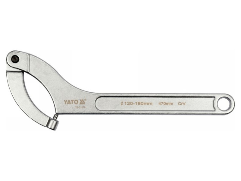 YATO YT-01679 brand hook wrench with round bolt, articulated YT-01679.Made of durable CrV chrome vanadium steel. Matte chrome finish on the surface of the wrench. Designed for servicing flanges, rings, and bearings.