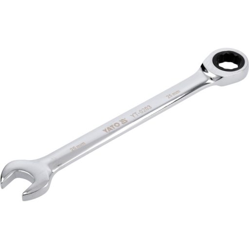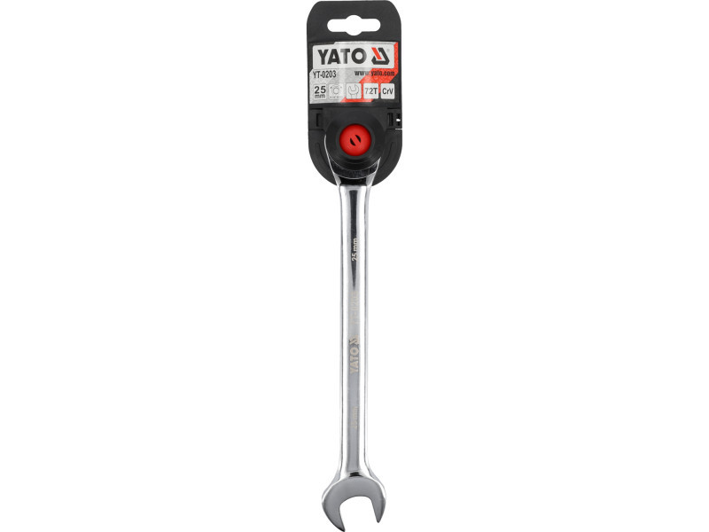 Flat-pocket key with YATO ratchet. The key is made of high quality CRV6140 tool steel, additionally chrome and polished surfaces. The tool is equipped with a 72 dental ratchet with a specially profiled twelve-legged shape. The range of right and left turnover and a minimum work angle of 5 degrees allows you to unscrew the screws in extremely hard to reach places and allows you to limit working time by eliminating 2 movements in the key cycle. Designed to work in car workshops and websites.