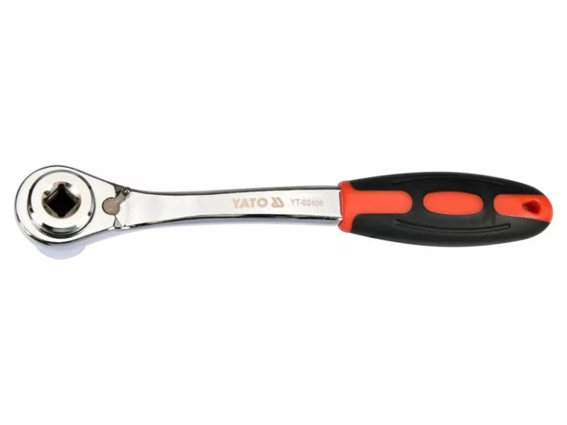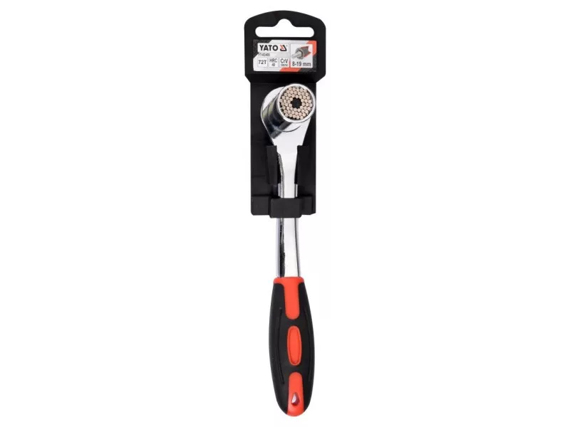 The key with the Yato YT-02400 universal attachment. The key with a bent profile, with a universal attachment with a diameter of 8-19 mm. Designed to unscrew various types of screws. • Made of high quality CRV steel, resistant to mechanical damage • hardness: 40 HRC • right/left rotation switch • ergonomic, rubberized plastic handle is provided by a stable grip