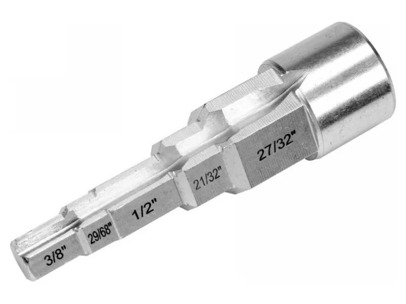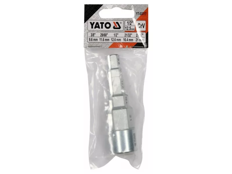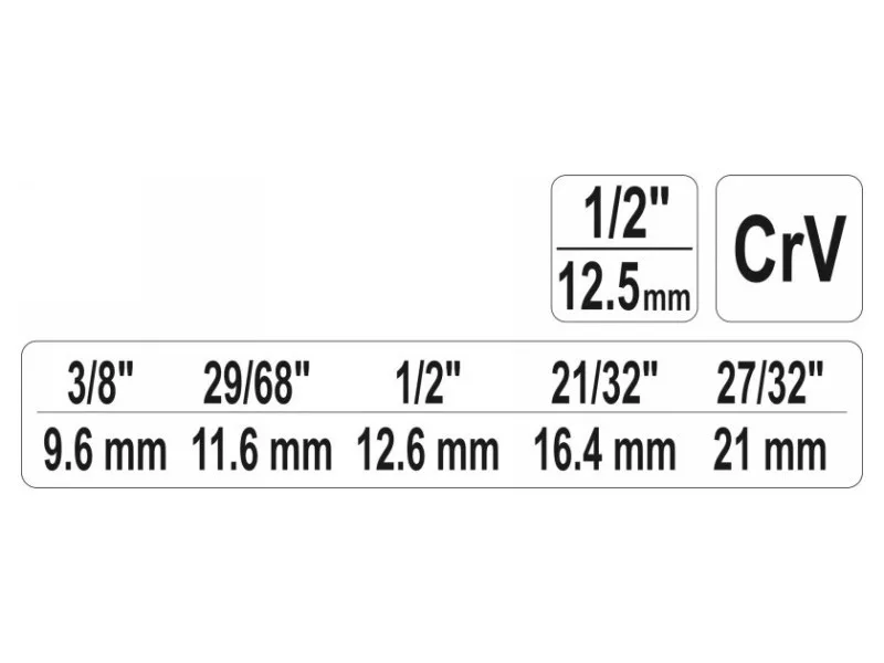 A 3/8" (9.6 mm) / 29/68" (11.6 mm) / 1/2" (12.6 mm) / 21/32" (16.4 mm) / 27/32" (21 mm) drive 1/2" step wrench made of high-grade CRV steel. On both sides it has a notch designed for screwówrench with tabs.