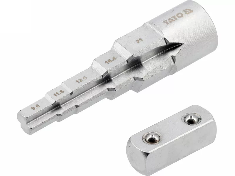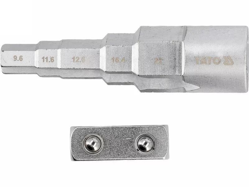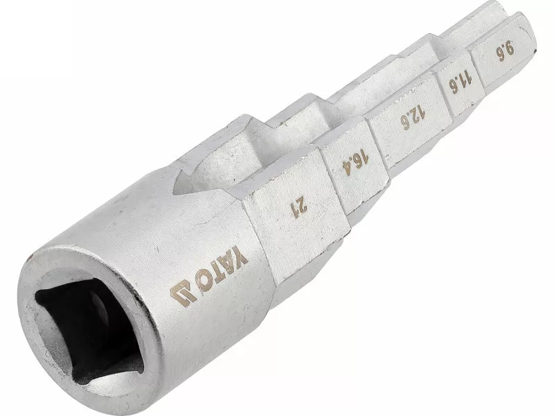 Graduated key with a 1/2" drive designed for installation work on heating fittings and threaded connections. Made of chrome-vanadium steel (CrV), it ensures high resistance to torsional loads and wear during frequent use. The graduated construction allows for handling multiple diameters with one tool, and the notches on both sides enable secure fitting in screws with protrusions.