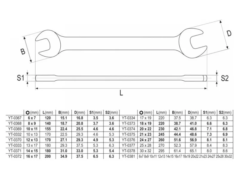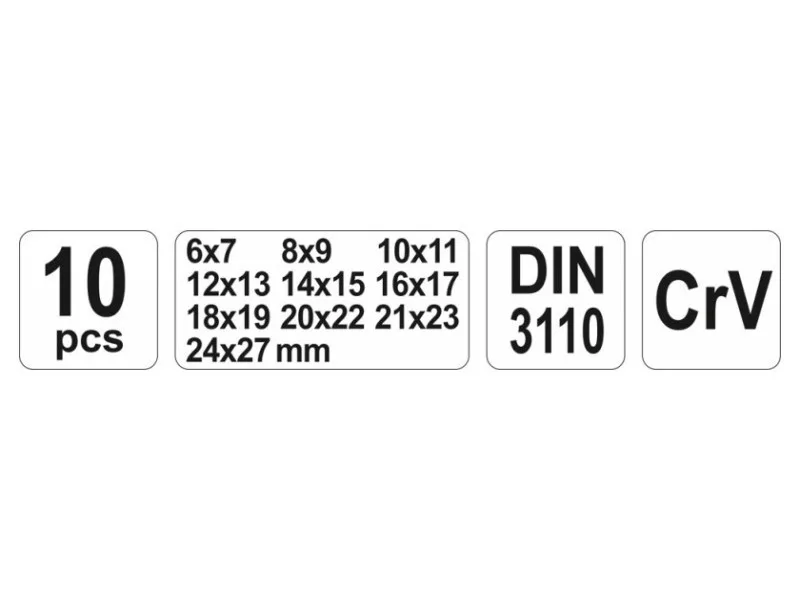 6 x 7, 8 x 9, 10 x 11, 12 x 13, 14 x 15, 16 x 17, 18 x 19, 20 x 22, 21 x 23, 24 x 27 mm
