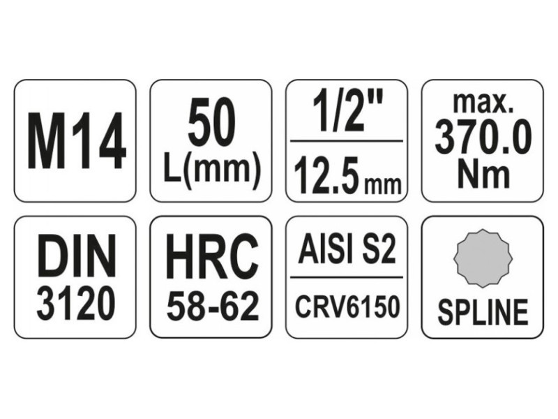 Professional SPLINE SPLINE, SIZE SIZE 1/2 ", MINE SIME M14. Chrome cap is made of CRV6150 steel, Aisi S2 steel mandrel and covered with a layer of nickel. An irreplaceable tool in a car or mechanical workshop.