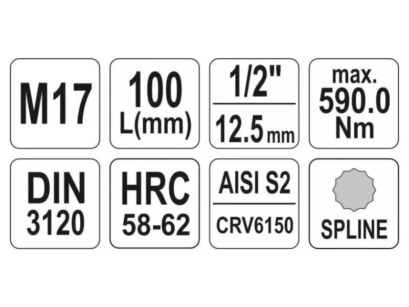 Professional SPLINE SPLINE, SIZE SIZE 1/2 ", MINE size M17. Chrome cap made of CRV6150 steel, Aisi S2 steel mandrel and covered with a layer of nickel. An irreplaceable tool in a car or mechanical workshop.