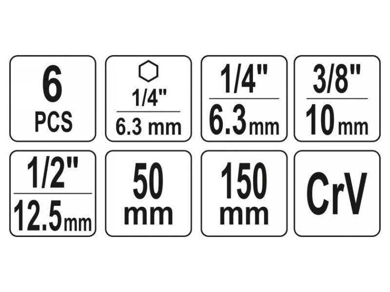 - length [mm]: 50 mm (1/4", 3/8" and 1/2") and 150 mm (1/4", 3/8" and 1/2")