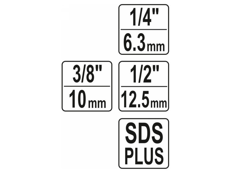 A set of SDS-plus adapters for 1/4, 3/8, 1/2 sockets by Yato YT-04685.