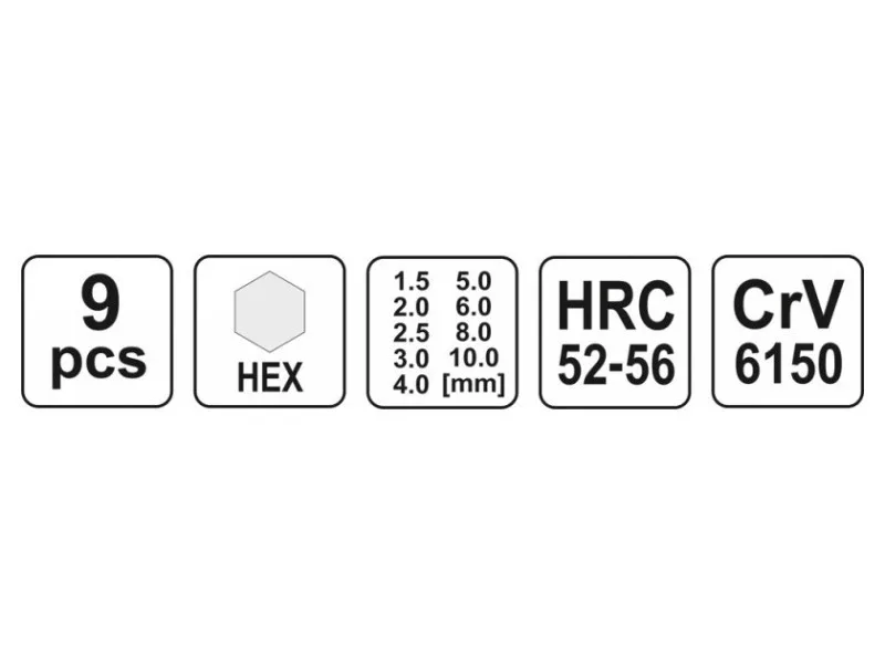 A professional set of Allen keys with a hex tip. The set is packed in a practical and handy plastic pendant that makes it easier to search for the right key size. Keys made of high quality CRV 6150 vanadium steel, characterized by strength and elasticity. Allen sort 52-55 HRC hardness.