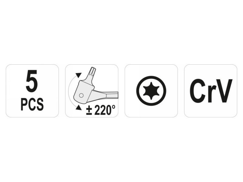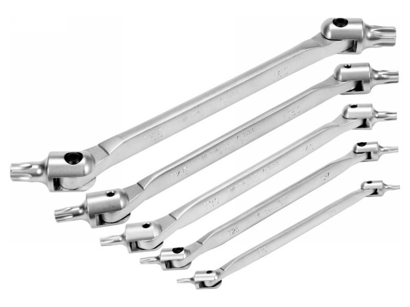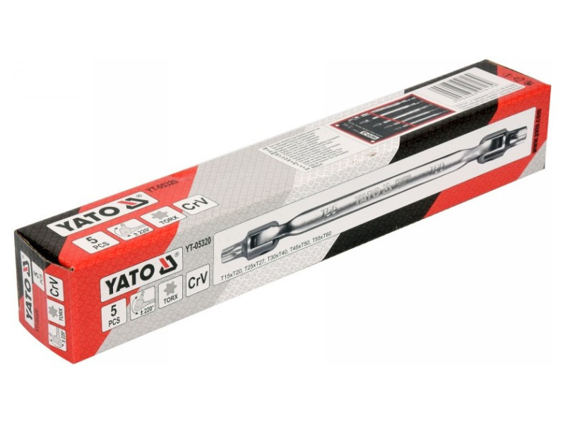 A set of articulated key wrenches TORX T15-T60 by YATO YT-05320. Designed for industrial, workshop and service applications. • Made of CRV steel, satin surface • Motion range: 220 ° • useful when unscrewing hard to reach screws. T15 x T20 T25 x T27 T30 x T45 T45 x T50 T55 x T60