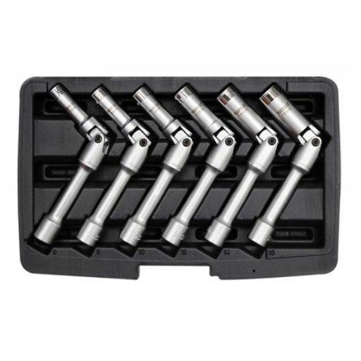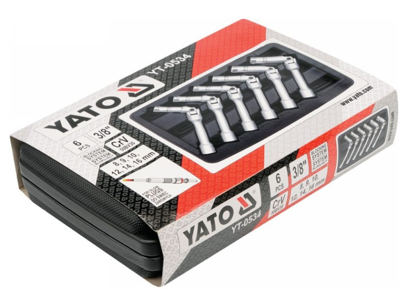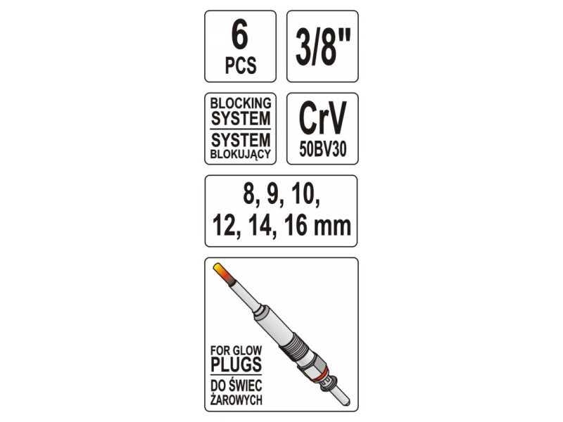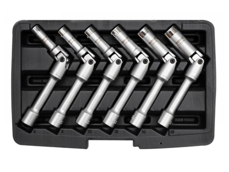 Keys made of chrome-vanadium steel with CRV 50BV30 symbol. A special key design with a joint and a protective pad allows you to easily dismantle the glow plugs, even in hard to reach places. The keys work with the 3/8 "knob. - Keys: 8 mm, 9 mm, 10 mm, 12 mm, 14 mm, 16 mm - suitcase