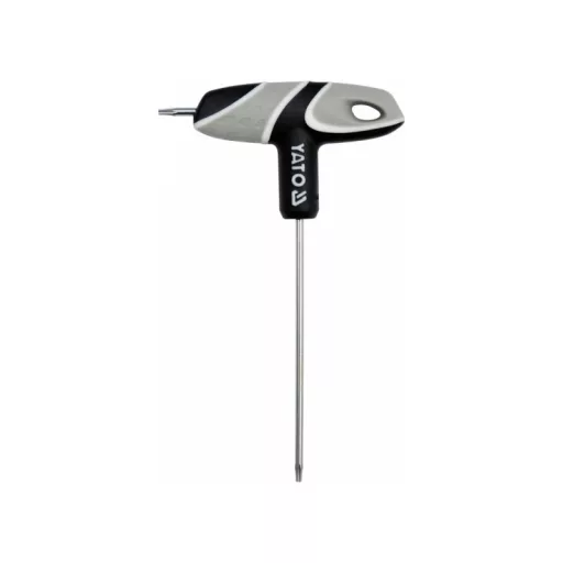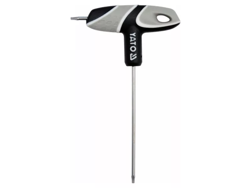 Professional Torx bound key with handle, T9 size size. A handy and solid plastic handle, while the mandrel is made of S2 steel. An irreplaceable tool in a car or mechanical workshop.