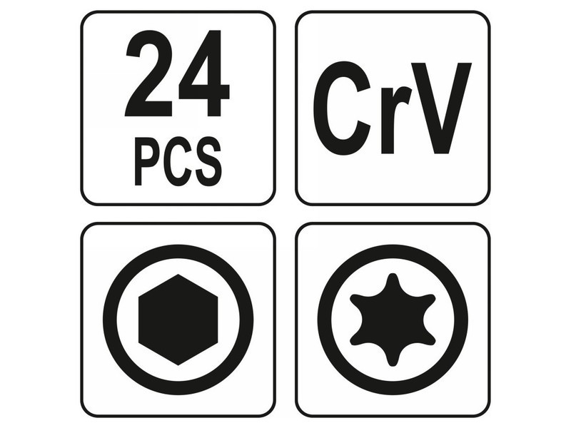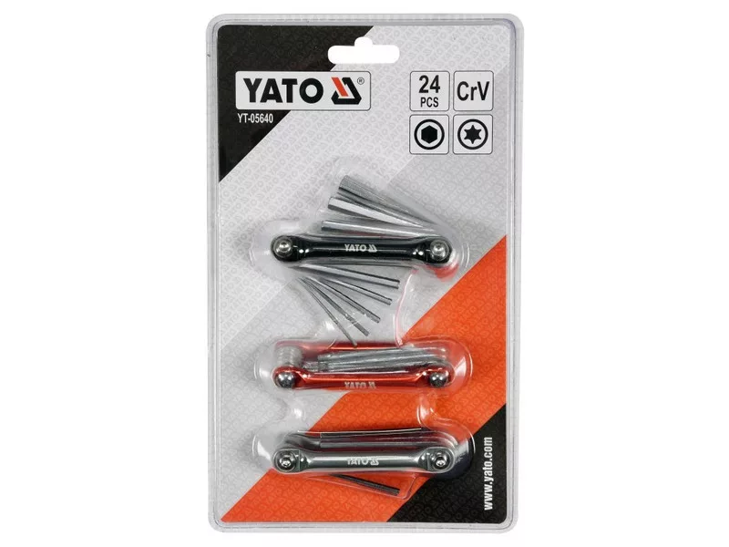 Set of Allen keys by YATO YT-05640. Universal Allen keys hidden in a practical body. Used to unscrew the screws and screws, among others on car services and furniture. They facilitate work at an angle and in places with difficult access. • Made of high quality CRV steel • aluminum handle. 3 sets in different colors containing 24 keys: black - 1.5, 2, 2.5, 3, 4, 5, 6, 8 mm red - TORX: T6, T7, T8, T9, T10, T15, T20, T25 Steel - 1/ 16ʺ, 5/64ʺ, 3/32ʺ, 1/8ʺ, 9/64ʺ, 5/32ʺ, 3/16ʺ, 1/4ʺ