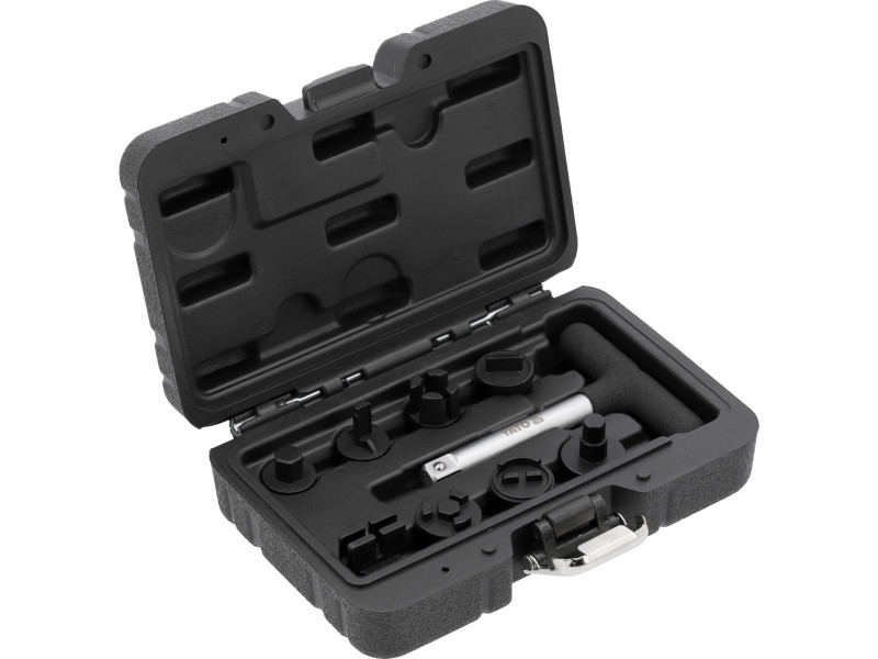 A set of spanners designed to safely unscrew and screw on plastic oil plugs. Sliding T-bar provides the correct screwing torque so that the plugs do not bake into the oil pan threads. It can handle 8 types of plugs on Audi, BMW, Dodge, Ford, Lincoln, Mercedes and VW vehicles.