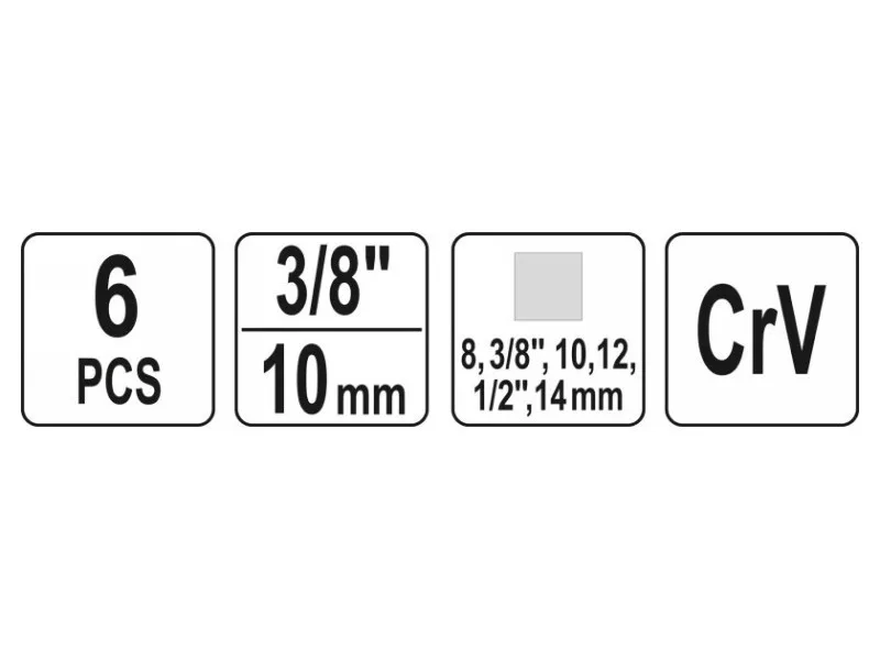 - Sizes: 8, 10, 12, 14 mm and 3/8" and 1/2" square