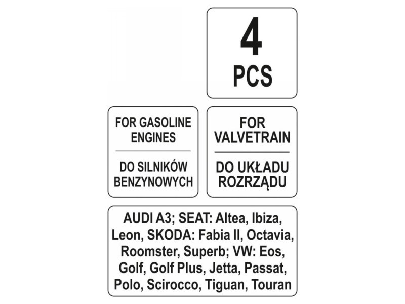 Professional 4-element timing set for FSI and TFSI TFSI engine. The kit includes a GMP setting device, roller locking device, tensioner roller rollers and a locking screw. Dedicated to cars with FSI + TFSI engines: Audi A3; SEAT: Altea, Ibiza, Leon, Skoda: Fabia II, Octavia, Roomster, Superb; VW: EOS, Golf, Golf Plus, Jetta, Passat, Polo, Scirocco, Tiguan, Touran