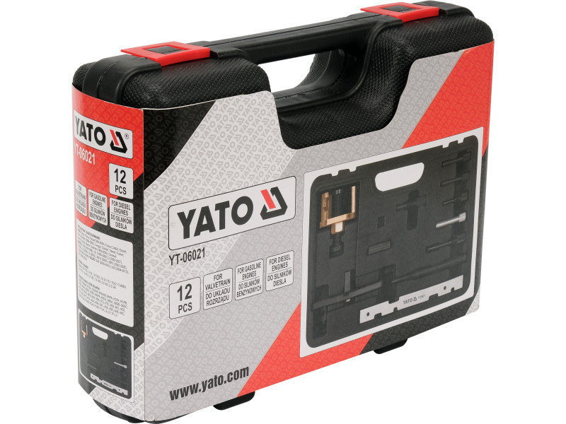 The set of YT-06021 timing locks for Ford, Mazda, Volvo cars with gasoline and diesel engines. The set includes camshaft locking device, injection pump locking device, flywheel locking device, gear puller and locking screws. Designed to service engines: Diesel 1.8 D / TD, 1.8 Di, 1.8 TDCi, 2.5 Di / TD / TDCi / TURBO; Gasoline: 1.25 16 V, 1.4 16 V, 1.6 16 V, 1.8 16 V, 2.0 16 V, 2.3 16 V.