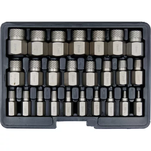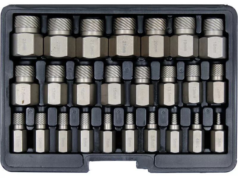Made of high quality CRV 50 steel with HRC 50-53 hardness. Its innovative spiral profile slides into the head of the bolt and allows safe removal of the bolt that has been locked. The complete set includes 25 unscrews in working ranges of 3mm to 23mm.
