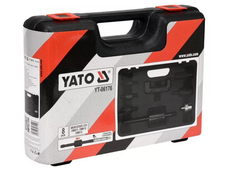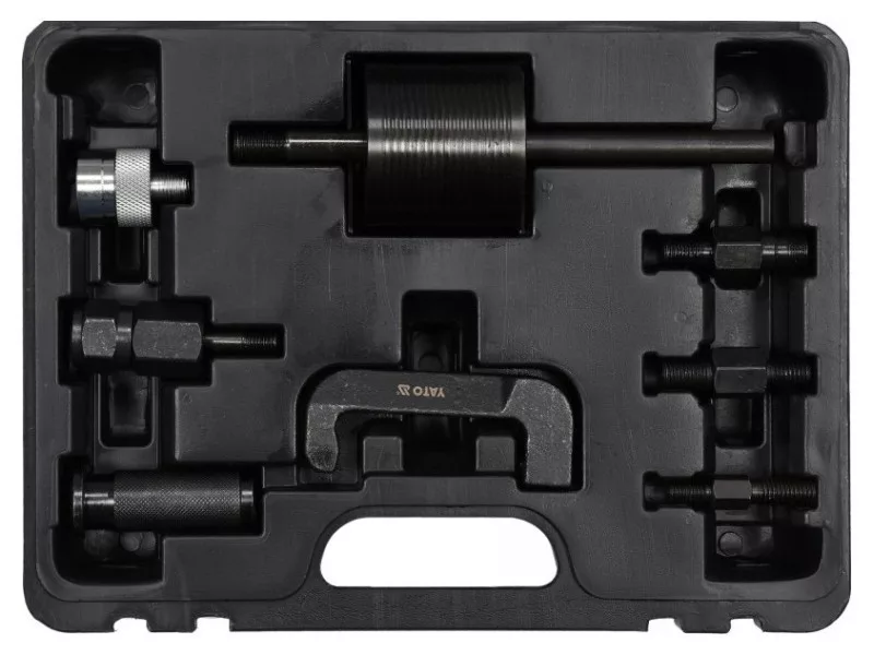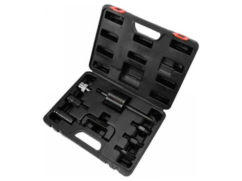 Professional kit for quick removal of baked common rail fuel system injectors from the engine head of carsóMercedes CDI. Fits injectors from manufacturersósuch as: Bosch, Denso, Delphi and Siemens. The kit includes 8 elementsów: inertia hammer, joint for working in hard-to-reach places and adapters.