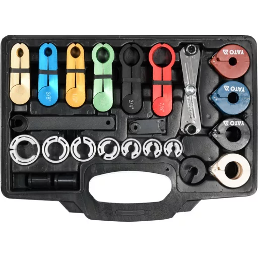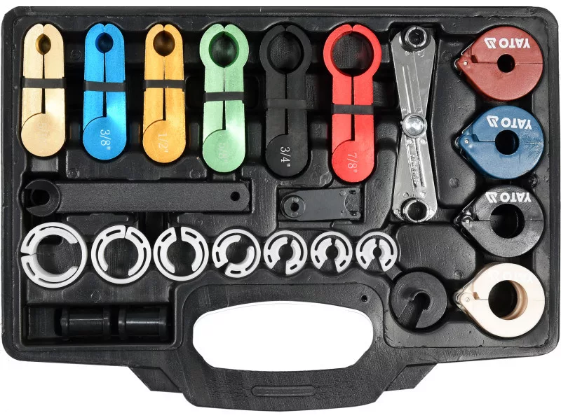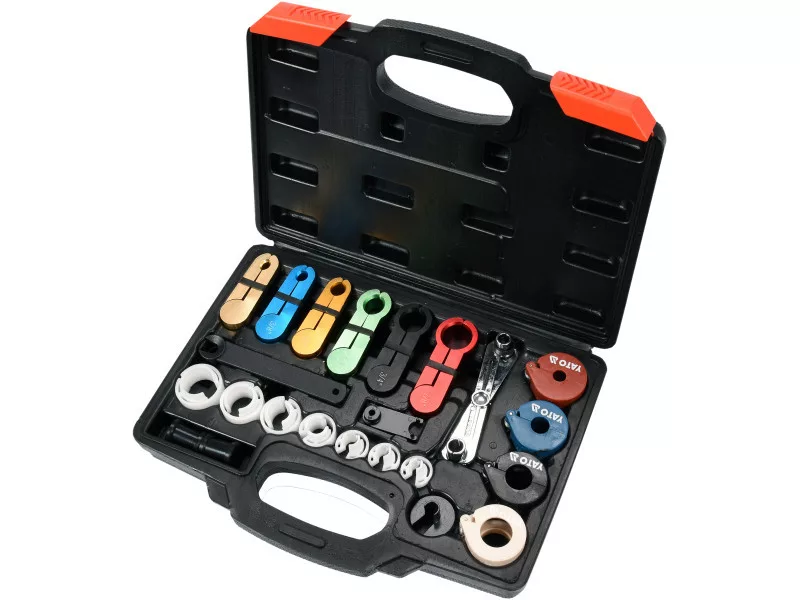 Professional set for unclamping, opening connectors of fuelósystems and air conditioning. They clamp the hoses and permanently block leaks. The clips are excellent for a variety of rubber and plastic hoses. The clips fit most makes of carsós allowing for example, to quickly block the flow of freon in air conditioning hoses. Universal set useful in any plant and workshop.