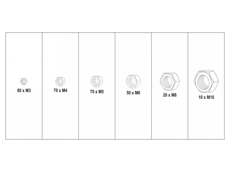 | Set includes | nuts x300 (M3 x80, M4 x70, M5 x70, M6 x50, M8 x20, M10 x10) |