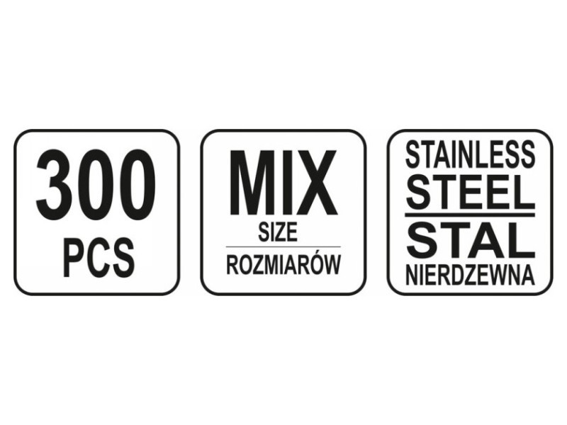 The set of 300 pieces of metric stainless caps contains the size M3, M4, M5, M6, M8, M10. The whole is placed in a convenient "sorter" packaging.