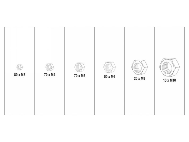 | Set includes | nuts x300 (M3 x80, M4 x70, M5 x70, M6 x50, M8 x20, M10 x10) |