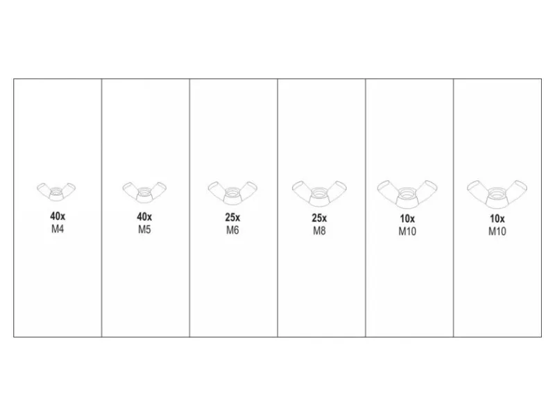 Set includeswing nuts x150 (M4 x40, M5 x40, M6 x25, M8 x25, M10 x20)