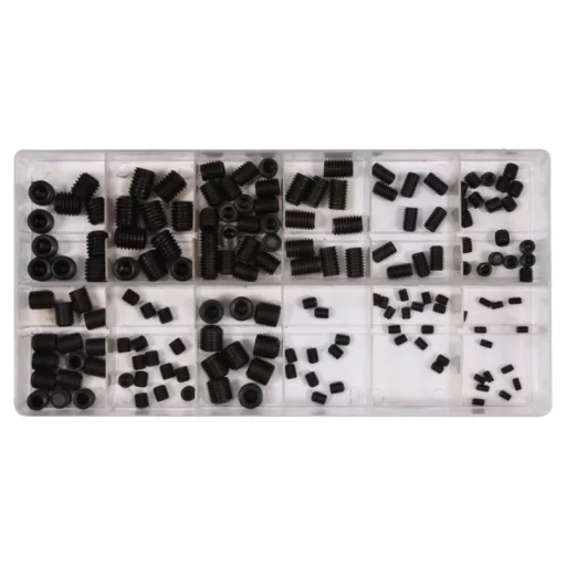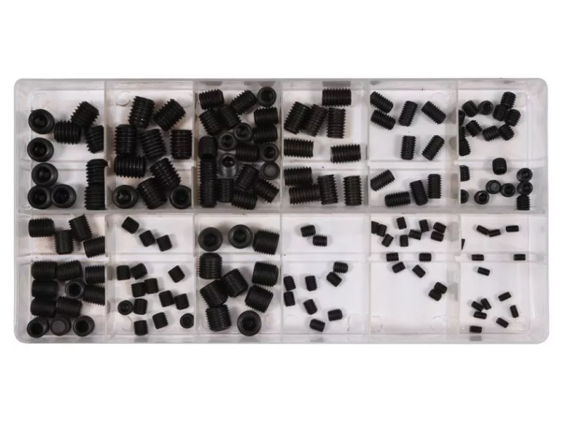 A set of 160 pieces of allen screws without heads - locating screws. The set includes sizes from 3x5 mm to 10x12 mm. The whole set is placed in a convenient "sorter" type package.