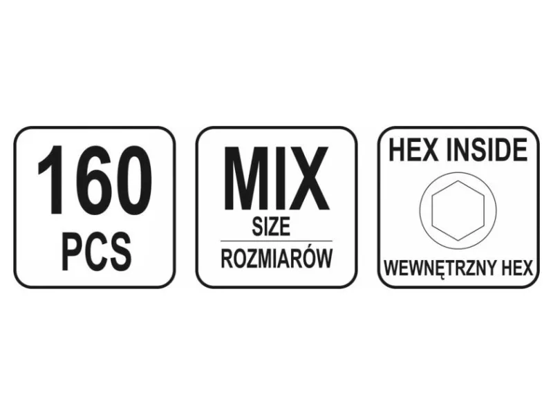 Set includesscrews x160 (3x5mm x15, 4x5mm x15, 5x6mm x10, 6x6mm x20, 6x6mm (F) x15, 6x10mm x10, 8x10mm x20, 8x10mm (F) x15, 8x12mm x10, 10x10mm x10, 10x10mm (F) x10, 10x12mm x10)