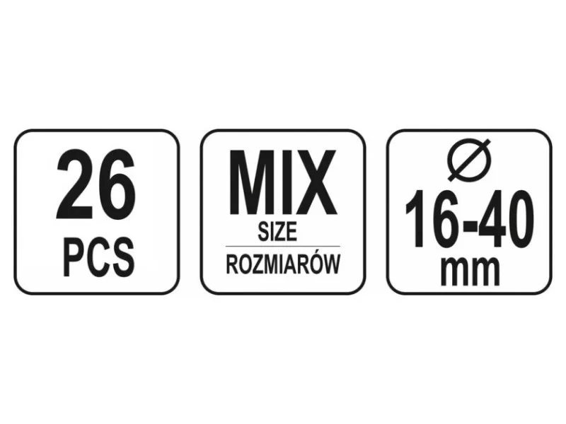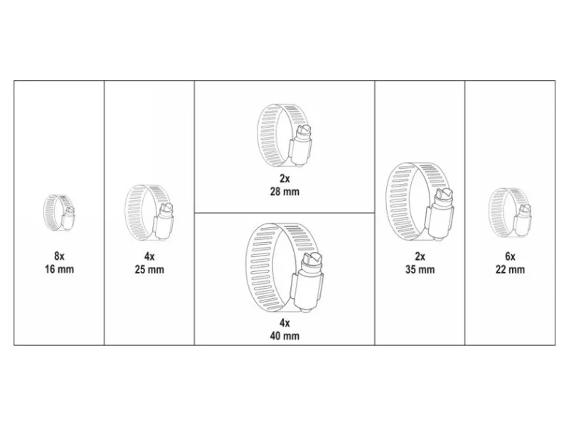 Set includesscrew clamps x26 (Ø16 mm x8, Ø22 mm x6, Ø25 mm x4, Ø28 mm x2, Ø35 mm x2, Ø40 mm x4)