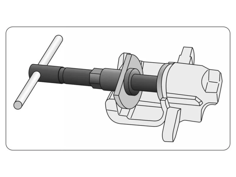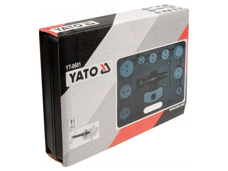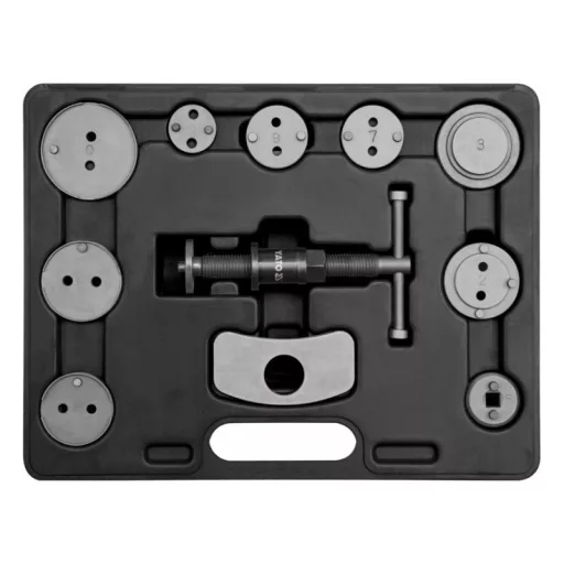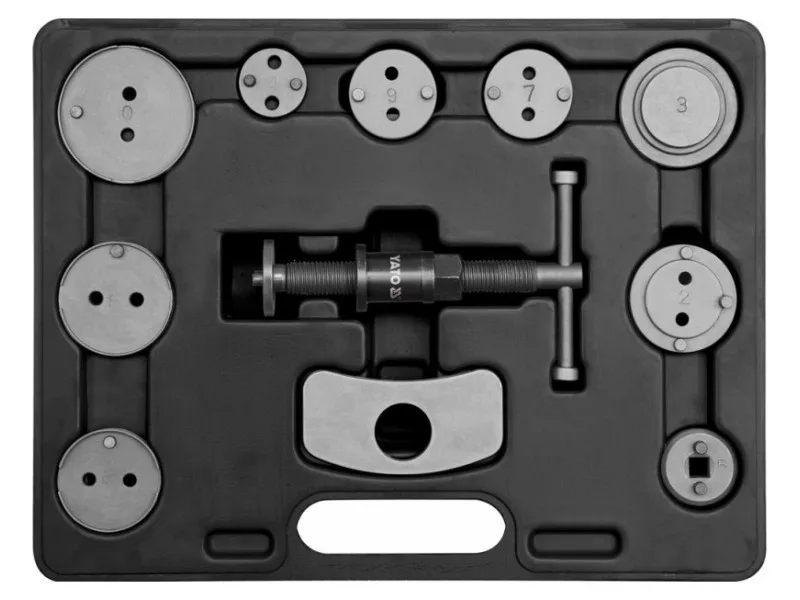 A professional set for dismantling brake pistons. The device consists of a right -handed screw and a set of plates that enable the replacement of pistons in a wide range of cars. Designed for cars: Citroen: XM, Xantia; Alfa Romeo; Audi; Austin; BMW; Honda; Jaguar; Mb; Mitsubishi; Nissan; Rover; Toyota; VW; Ford; Mazda; Subaru; Saab; Rover, commune The set is developed for the needs of specialized car and mechanical services.