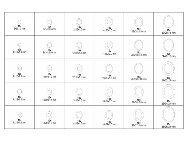 A set of 300 pieces of aluminum pads for oil trigger traffic jams. The kit includes 5x9x1.0 mm to 28x36x2.0 mm. The whole is placed in a convenient "sorter" packaging.