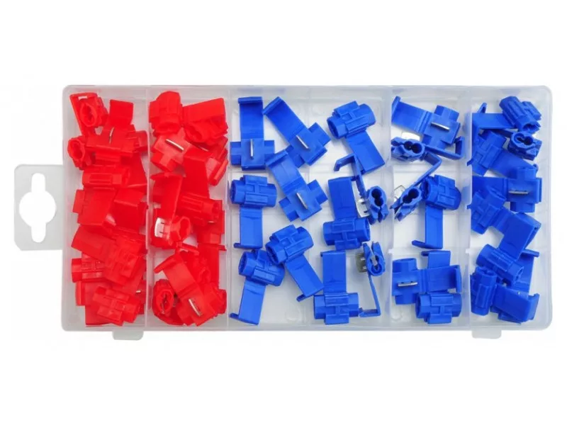 The set of electric quick connections contains fast connections in two colors and sizes matching the most popular diameters of electric wires. The set contains 50 elements, and the whole is placed in a convenient "sorter" packaging.