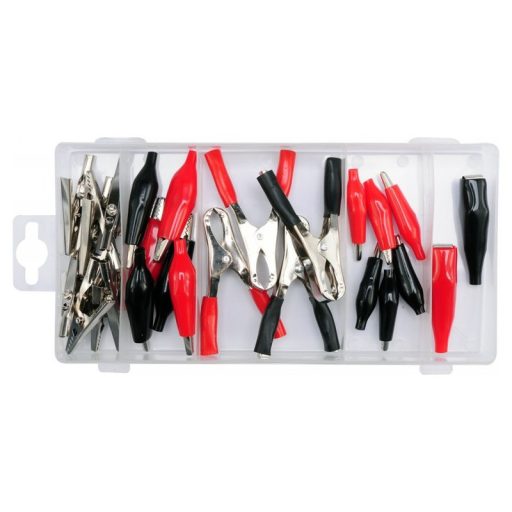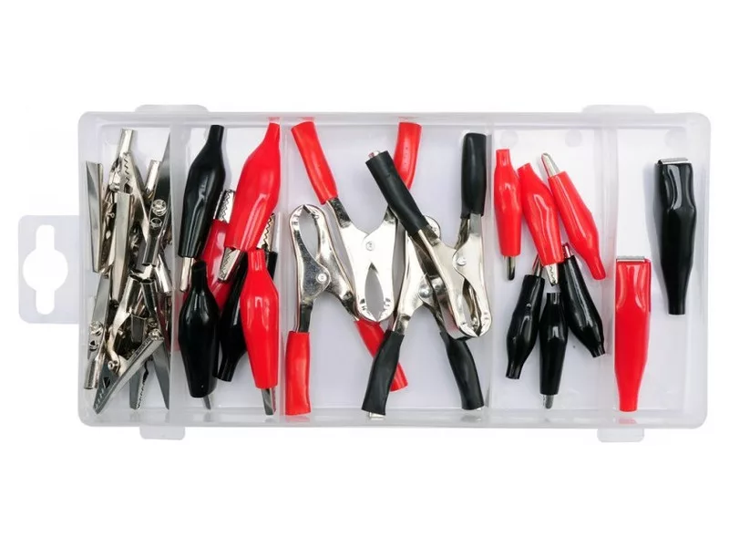 A set of electric crocodiles. The contents of the packaging are 28 crocodile pieces of various sizes, isolated and not insulated. The whole is placed in a convenient "sorter" packaging.