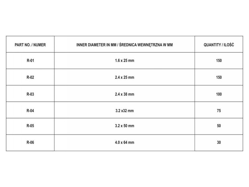 Set includesstraight pins x555 (1.6x25 mm x150, 2.4x25 mm x150, 2.4x38 mm x100, 3.2x32 mm x75, 3.2x50 mm x50, 4x64 mm x30)