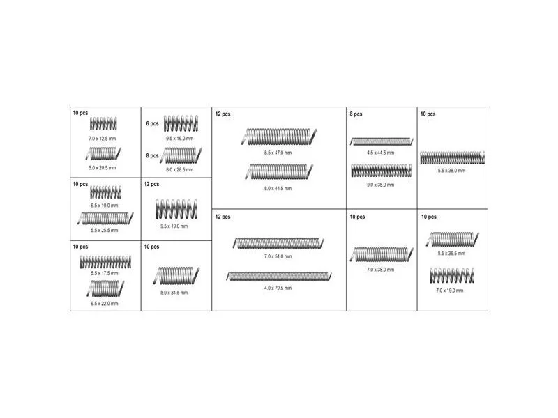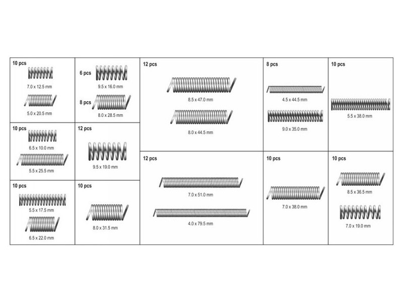 Set includesx200 springs (4x79.5 mm x12, 4.5x44.5 mm x8, 5x20.5 mm x10, 5.5x17.5 mm x10, 5.5x25.5 mm x10, 5.5x38 mm x10, 6.5x10 mm x10, 6.5x22 mm x10, 7x12.5 mm x10, 7x19 mm x10, 7x38 mm x10,
