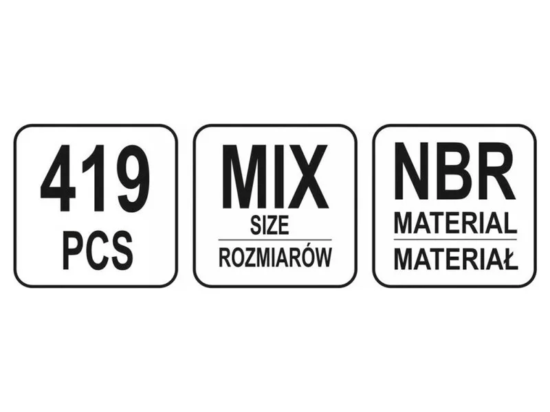 A set of 419 pieces of ORINGS made of NBR. The kit includes sizes from 3x1.5 mm to 50x3.5 mm. The whole is placed in a convenient "sorter" packaging.