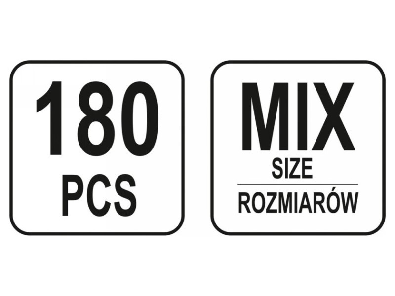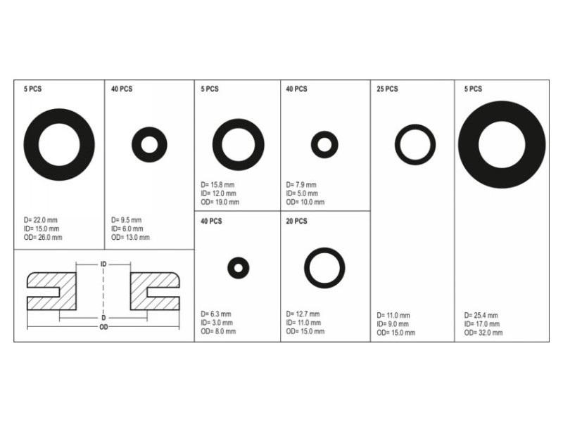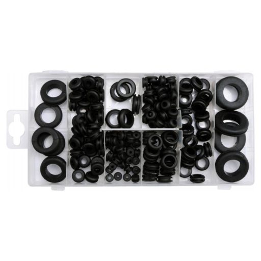Set includesrubber grommets x180 (6.3x3x8 mm x40, 7.9x5x10 mm x40, 9.5x6x13 mm x40, 11x9x15 mm x25, 12.7x11x15 mm x20, 15.8x12x19 mm x5, 22x15x26 mm x5, 25.4x17x32 mm x5)