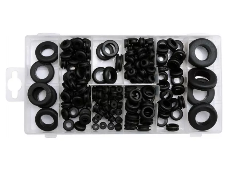 The set of rubber grommets contains 180 pieces in different sizes. The whole is placed in a convenient "sorter" type package.