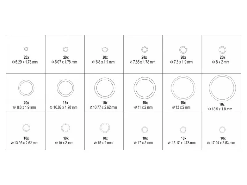 Set includes cont’dØ11x2 mm, Ø12x2 mm; x10: Ø10x2 mm, Ø13.9x1.8 mm, Ø13.95x2.62 mm, Ø15x2 mm, Ø17x2 mm, Ø17.04x3.53 mm, Ø17.17x1.78 mm