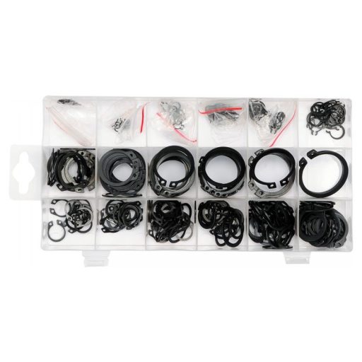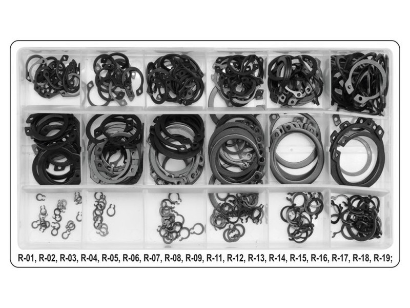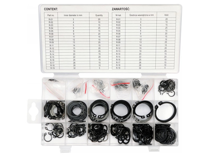 Set includesSeger rings external x300 (Ø3 mm x20, Ø4 mm x10, Ø5 mm x15, Ø6 mm x25, Ø8 mm x15, Ø9 mm x20, Ø11 mm x15, Ø12 mm x15, Ø13 mm x25, Ø14 mm x15, Ø15 mm x20, Ø19 mm x25, Ø20 mm x15,